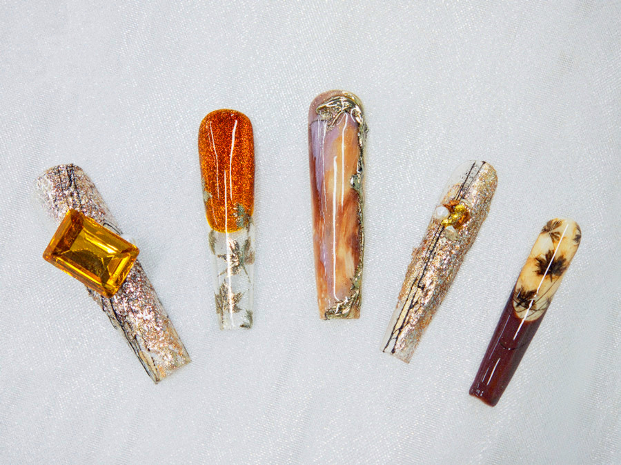 廣西美甲課堂實(shí)訓(xùn)、廣西美甲培訓(xùn)實(shí)操:整副作品主要是以暈染技術(shù)和水晶砂礫共同打造而成。以透明底作為底色,用暈染液打造出的琥珀色的圖案營造出夕陽的氛圍感。再用水晶砂和金箔紙繪制出楓葉,暈染出落日般的晚霞,整體視覺營造出了一種非常低調(diào)、優(yōu)雅、夢幻的精致感。