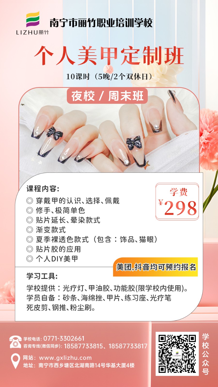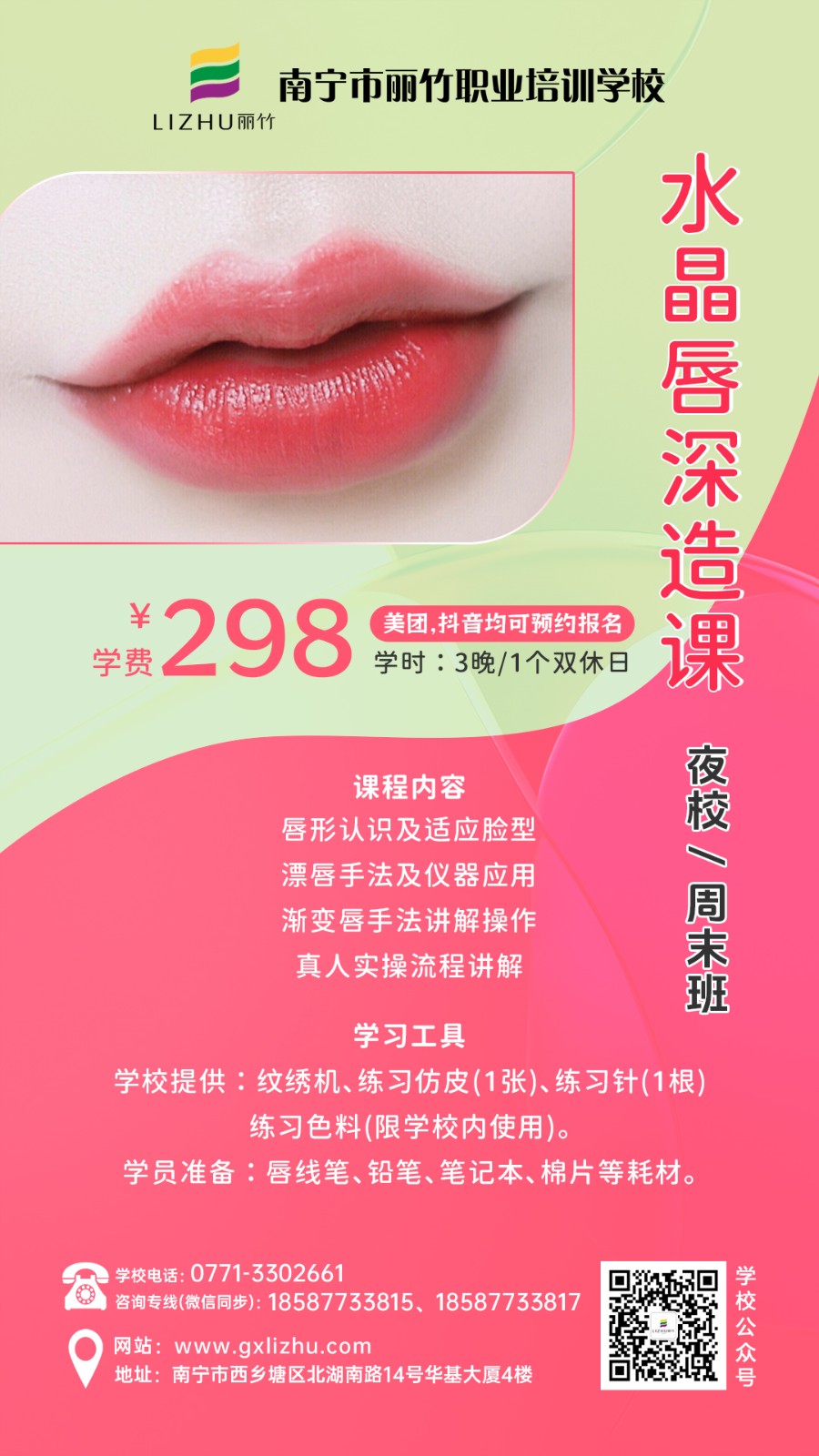 廣西彩妝造型學(xué)校、廣西美甲培訓、廣西美容短期班、廣西培訓紋唇、廣西紋繡眉眼唇學(xué)習分享:麗竹學(xué)校特色課程(夜校/周末班)熱門(mén)火爆技能課程重磅來(lái)襲啦!課程涵蓋化妝,美甲,美容,紋繡等技能,感興趣的小伙伴趕緊關(guān)注麗竹學(xué)校了解更多課程詳情和現在正在進(jìn)行的優(yōu)惠活動(dòng)詳情。