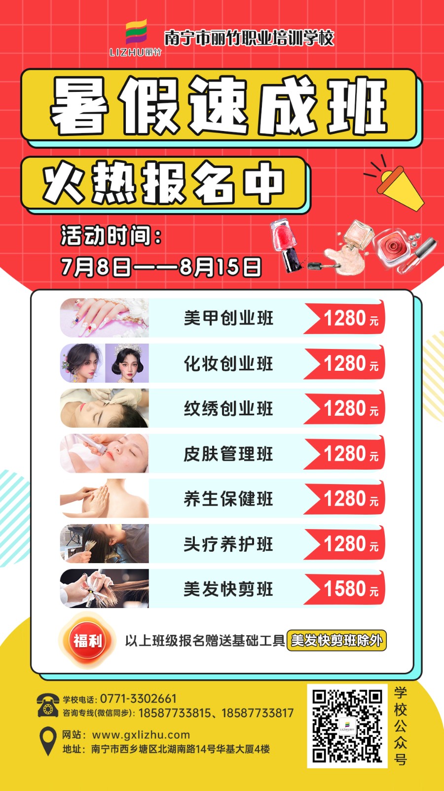如果你想在廣西學(xué)美容美發(fā),想知道廣西化妝美甲學(xué)費多少?想知道廣西紋繡去哪學(xué)……那就千萬(wàn)不要錯過(guò)廣西美容美發(fā)化妝美甲(麗竹學(xué)校)暑假速成班推出的課程報名活動(dòng)啦!